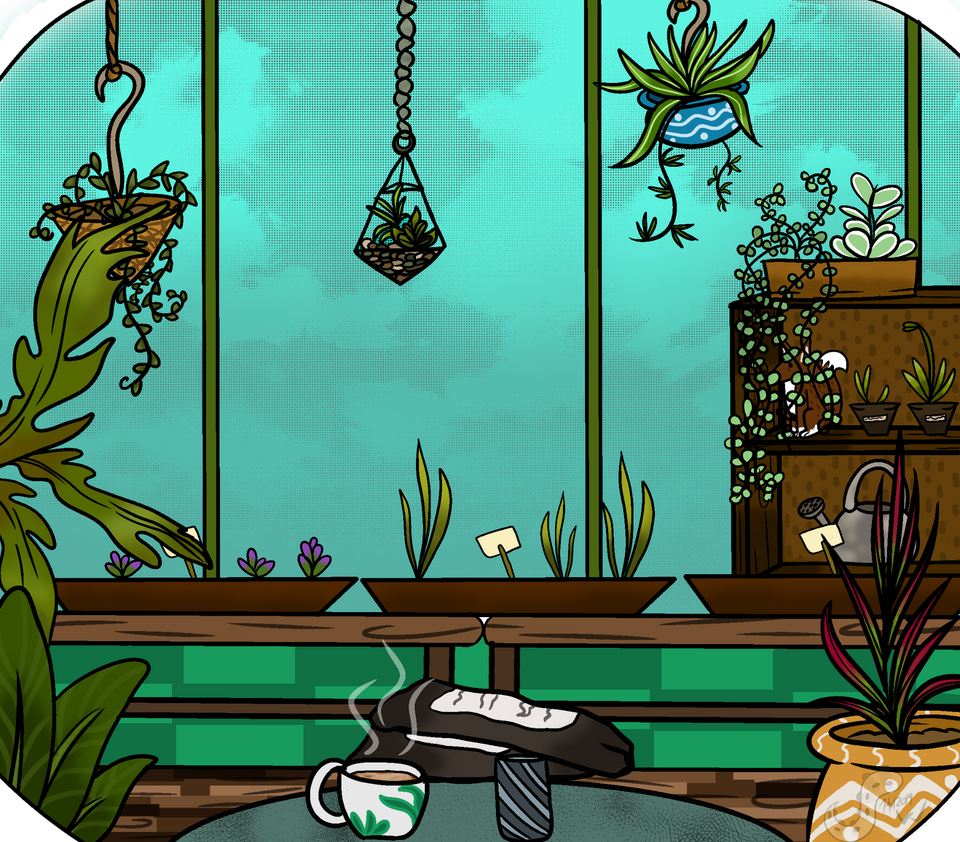 Drawn by Luka, His green room in which he loves to read, tend to his plants and listen to music.